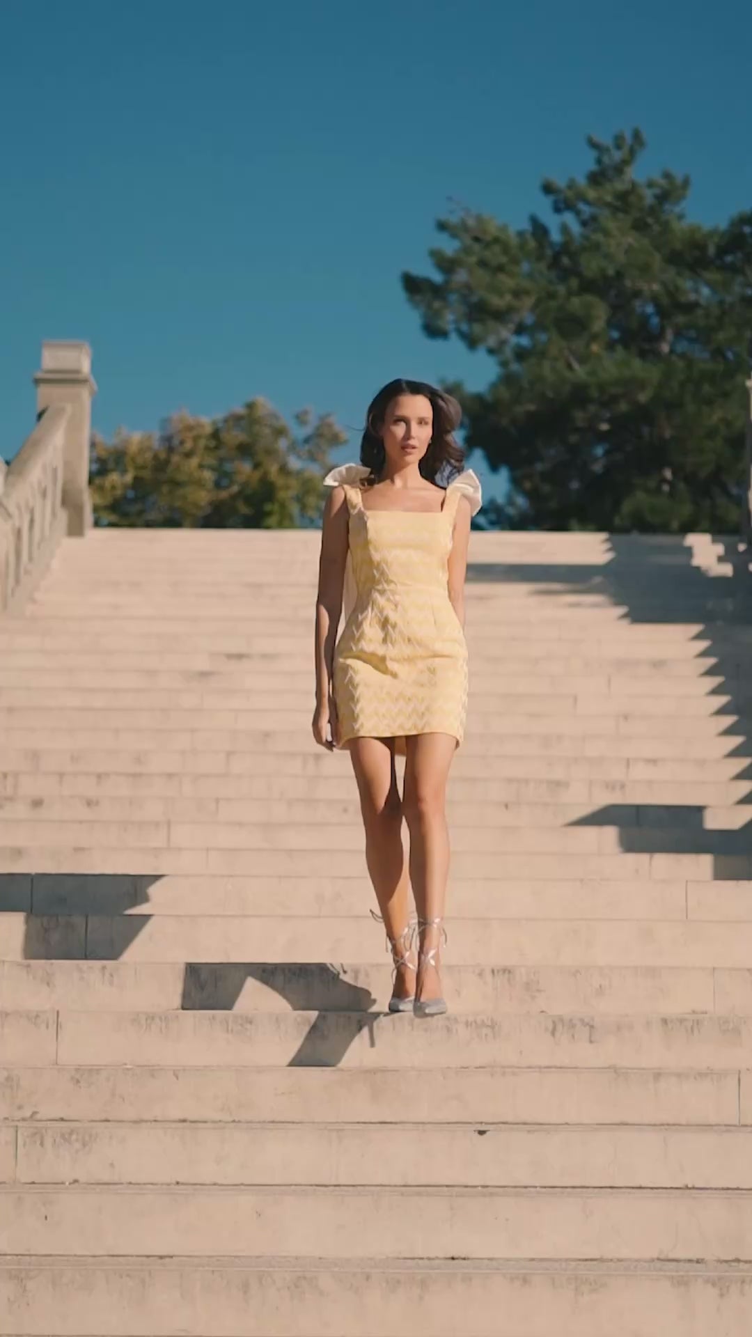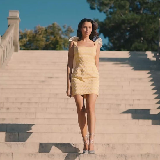 Bright, bold, and effortlessly chic — the Mila Brocade Mini Dress is a celebration of playful sophistication. Crafted from exquisite Missoni-inspired brocade, the dress features a striking yellow-and-white chevron weave that radiates energy and modern elegance.