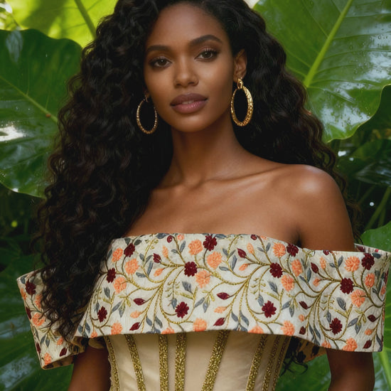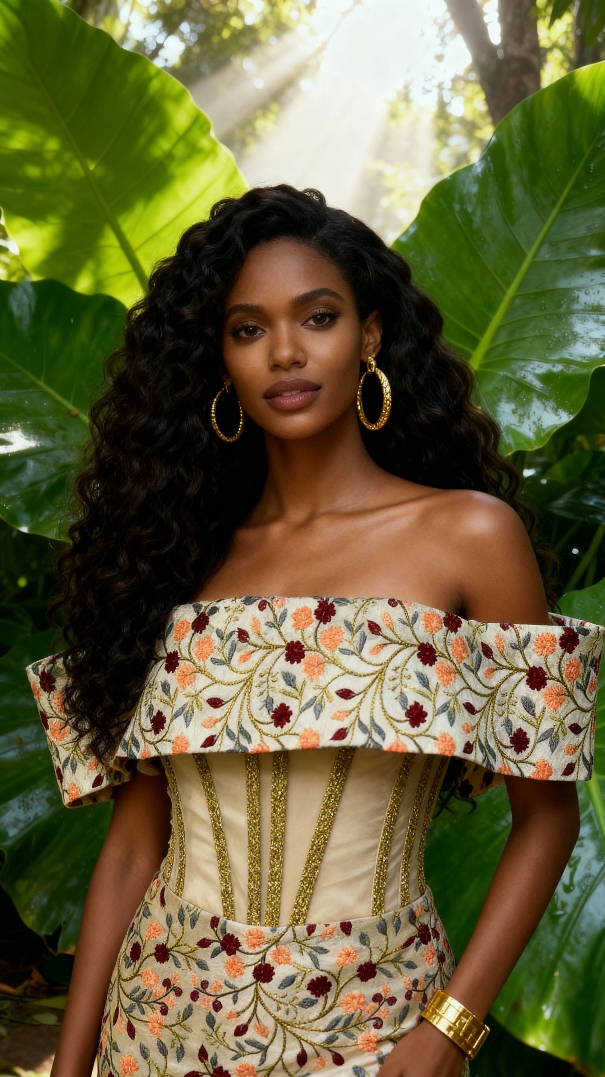 The bodice is accentuated with golden corset boning, adding both structure and allure while gracefully highlighting the waist. The fitted silhouette flows into a tailored midi skirt, making this piece perfect for formal soirées, garden weddings, or any moment where you want to make a lasting impression.