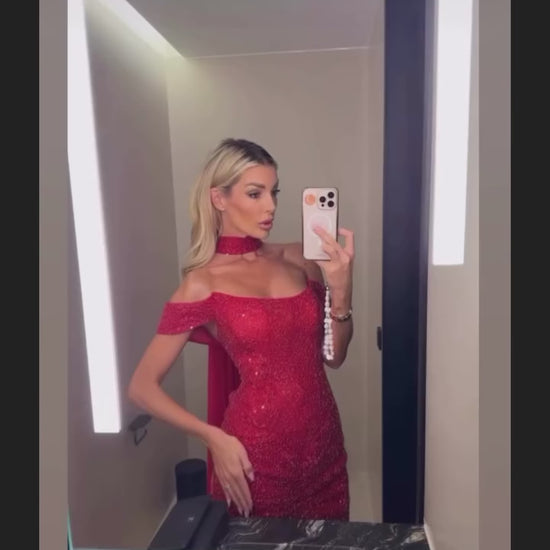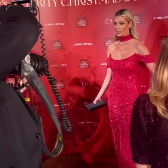 The MARIA silhouette features a sculpted bodice that contours the figure, flowing seamlessly into a floor-length design. The true statement lies in the luxurious cape, cascading effortlessly from the shoulders — a vision of strength and grace in motion.